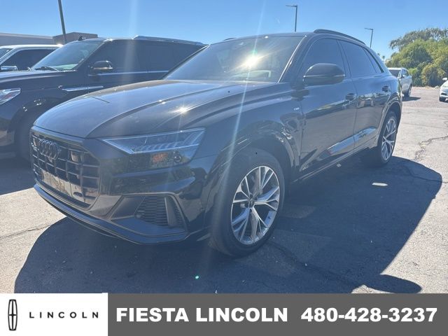 This Audi Q8 is equipped with Contour/Ambient LED Interior Lighting Package, Convenience Package (Audi Adaptive Cruise Assist w/Lane Guidance, Audi Phone Box w/Wireless Charging, Heated Steering Wheel, and Top View Camera System), Premium Plus Package (4-Zone Automatic Climate Control, Bang & Olufsen 3D Premium Sound System, Front Seats w/Ventilation, and Illuminated Door Sills), S Line Style Package (S Line Exterior, S Line Fender Badges, S Line Illuminated Door Sills, and Wheels: 21" 5-W-Spoke-Design Graphite Gray Finish), 10 Speakers, 4-Wheel Disc Brakes, ABS brakes, Adaptive suspension, Air Conditioning, Alloy wheels, AM/FM radio: SiriusXM, Audi Guard Protection Kit, Auto High-beam Headlights, Auto-dimming door mirrors, Auto-dimming Rear-View mirror, Automatic temperature control, Axle Ratio: TBD, Brake assist, Bumpers: body-color, Compass, Delay-off headlights, Driver door bin, Driver vanity mirror, Dual front impact airbags, Dual front side impact airbags, Electronic Stability Control, Emergency communication system: Audi connect CARE, Exterior Parking Camera Rear, Four wheel independent suspension, Front & Rear Doors Audi Beam-Rings, Front anti-roll bar, Front Bucket Seats, Front Center Armrest, Front dual zone A/C, Front fog lights, Front reading lights, Fully automatic headlights, Garage door transmitter: HomeLink, Genuine wood door panel insert, Headlight cleaning, Heated door mirrors, Heated Front Bucket Seats, Heated front seats, Illuminated entry, Illuminated Front Audi Rings, Integrated Toll Module Credit (DISC), Leather Seating Surfaces, Leather Shift Knob, Leather steering wheel, Low tire pressure warning, Memory seat, Navigation system: Audi MMI Navigation plus with Touch Response, Occupant sensing airbag, Outside temperature display, Overhead airbag, Overhead console, Panic alarm, Passenger door bin, Passenger vanity mirror, Power door mirrors, Power driver seat, Power Liftgate, Power moonroof: Panoramic, Power passenger seat, Power steering, Power windows, Radio data system, Radio: Audi MMI Nav Plus w/MMI Touch Response, Rain sensing wipers, Rear air conditioning, Rear anti-roll bar, Rear fog lights, Rear reading lights, Rear seat center armrest, Rear side impact airbag, Rear window defroster, Rear window wiper, Remote keyless entry, Security system, Speed control, Speed-sensing steering, Split folding rear seat, Spoiler, Steering wheel memory, Steering wheel mounted audio controls, Tachometer, Telescoping steering wheel, Tilt steering wheel, Traction control, Trip computer, Turn signal indicator mirrors, Variably intermittent wipers, and Wheels: 21" 5-Segment-Spoke Design. Recent Arrival! Odometer is 9021 miles below market average!